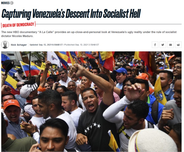 Un article du Daily Beast (13/09/21) promouvant le film est intitulé « Death of a democracy. Capturing Venezuela’s Descent Into Socialist Hell » (« Mort d’une démocratie. Photographier la descente du Venezuela dans l’enfer socialiste »), ce qui explique pourquoi il a trouvé pour sa diffusion une puissante plateforme privée comme HBO Max, une filiale de AT&T’s Warner Media.