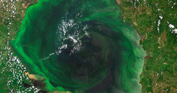 “Même s’ils offrent un beau spectacle depuis l’espace, les tourbillons vert émeraude des eaux du lac, visibles sur cette photo [prise en] août 2023 [et publiée en novembre], traduisent une prolifération de cyanobactéries toxiques, ou algues bleu-vert, qui représentent une menace pour l’environnement et la santé humaine”, détaille l’Agence spatiale européenne (ESA).